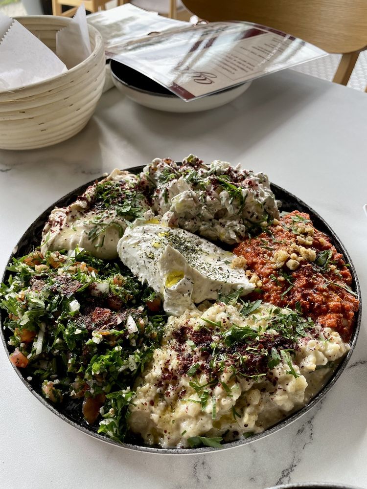 mix platter of hummus, baba ghanoush, muhammarah, tabbouleh, salata tahina & labneh